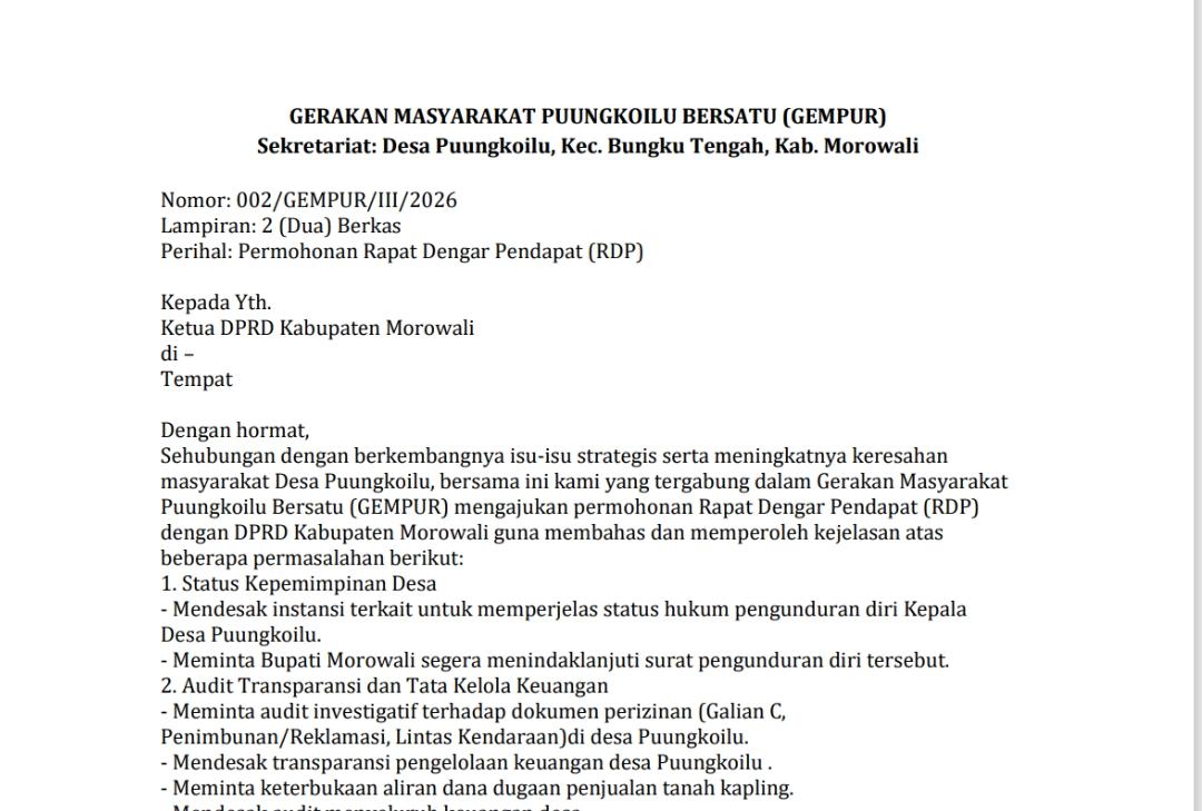 Gerakan Masyarakat Puungkoilu Bersatu (GEMPUR) menyoroti ketegasan administrasi Pemerintah Daerah Morowali, khususnya di tingkat pemerintah desa, dalam menyikapi status seorang kepala desa yang tengah menjalani proses penurunan jabatan. Sorotan tersebut